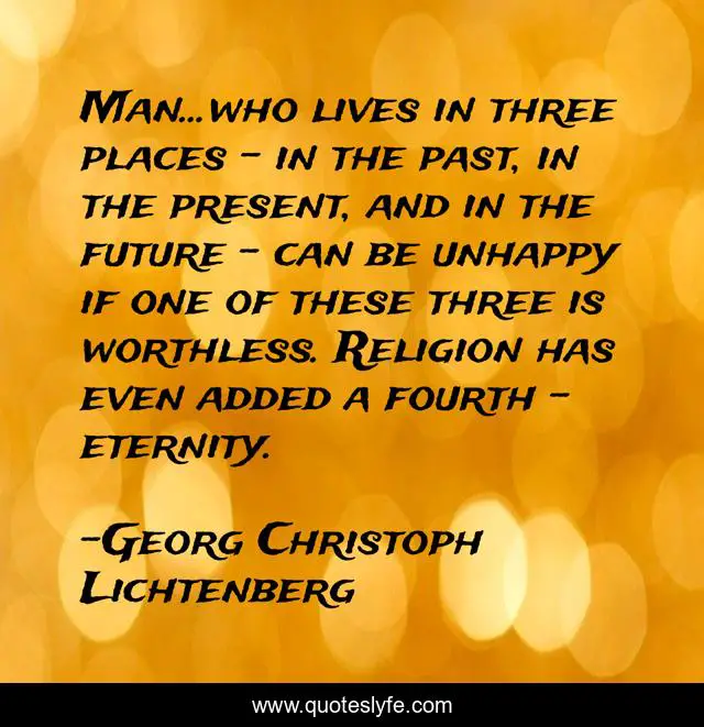 This page presents the quote "Man…who lives in three places – in the past, in the present, and in the future – can be unhappy if one of these three is worthless. Religion has even added a fourth – eternity.". Author of this quote is Georg Christoph Lichtenberg. This quote is about eternity, life, past, religion, future, present, time, happiness,.