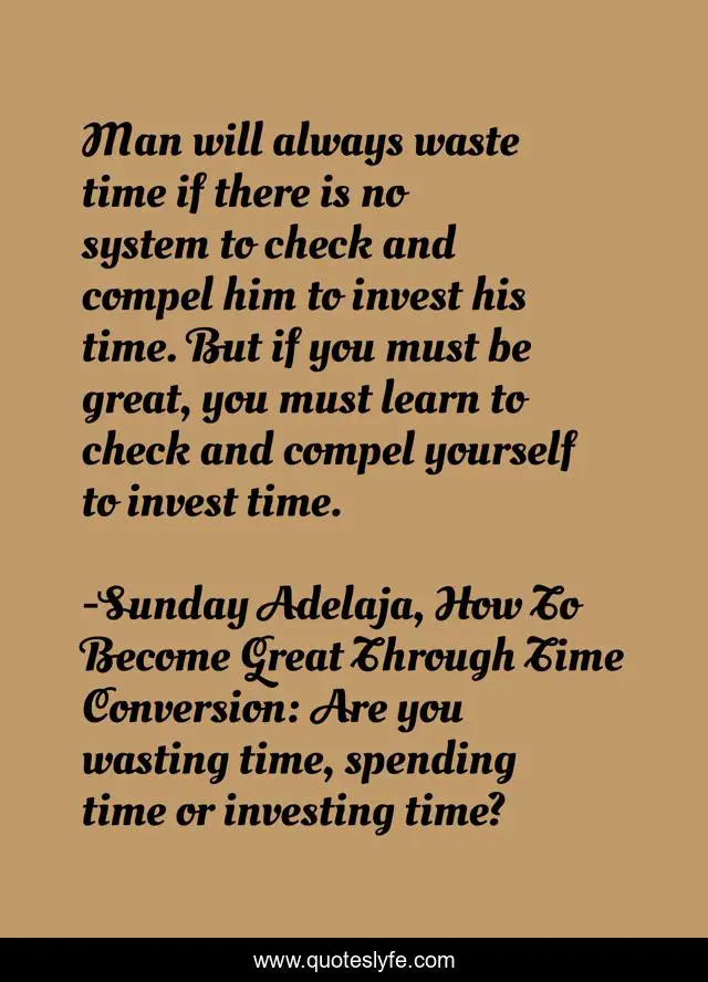 This page presents the quote "Man will always waste time if there is no system to check and compel him to invest his time. But if you must be great, you must learn to check and compel yourself to invest time.". Author of this quote is Sunday Adelaja, How To Become Great Through Time Conversion: Are you wasting time, spending time or investing time?. This quote is about life, investment, conversion, productivity, wealth, time-investment, greatness, waste, humanity,.