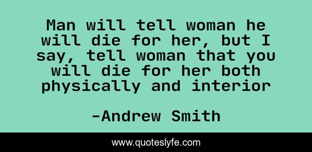 This page presents the quote "Man will tell woman he will die for her, but I say, tell woman that you will die for her both physically and interior". Author of this quote is Andrew Smith. This quote is about life, brave, love, peace, courage, chastity, inspirational, enthusiasm, grace,.