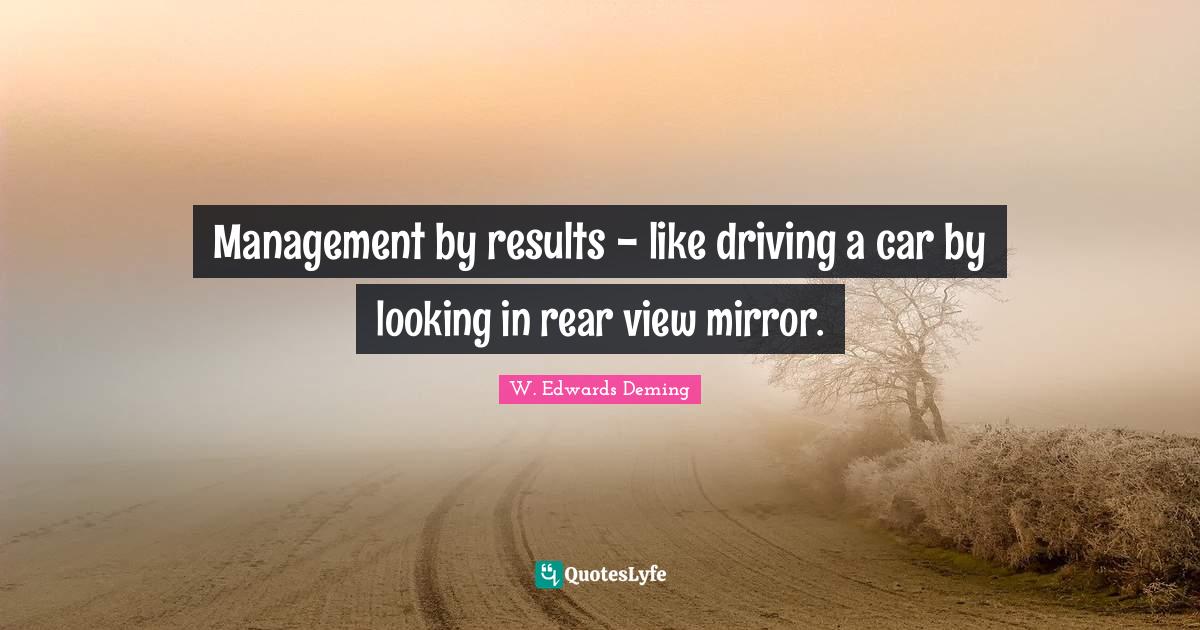 This page presents the quote "Management by results - like driving a car by looking in rear view mirror.". Author of this quote is W. Edwards Deming. This quote is about management, results, rear view mirror, mirrors, driving, views, car,.