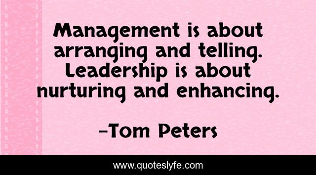 This page presents the quote "Management is about arranging and telling. Leadership is about nurturing and enhancing.". Author of this quote is Tom Peters. This quote is about nurturing, management,.