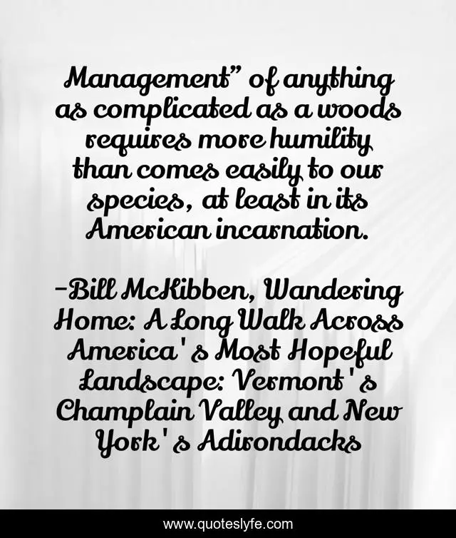 This page presents the quote "Management" of anything as complicated as a woods requires more humility than comes easily to our species, at least in its American incarnation.". Author of this quote is Bill McKibben, Wandering Home: A Long Walk Across America's Most Hopeful Landscape: Vermont's Champlain Valley and New York's Adirondacks. This quote is about environmentalism, woods, humility, conservation,.
