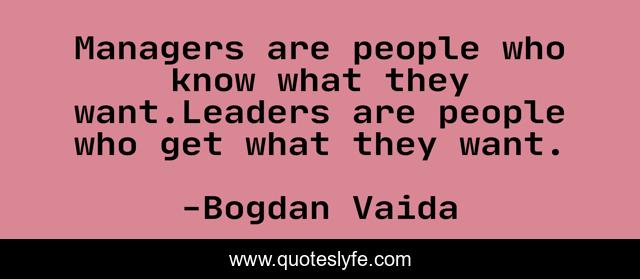 This page presents the quote "Managers are people who know what they want.Leaders are people who get what they want.". Author of this quote is Bogdan Vaida. This quote is about management, managers, leaders, leadership,.