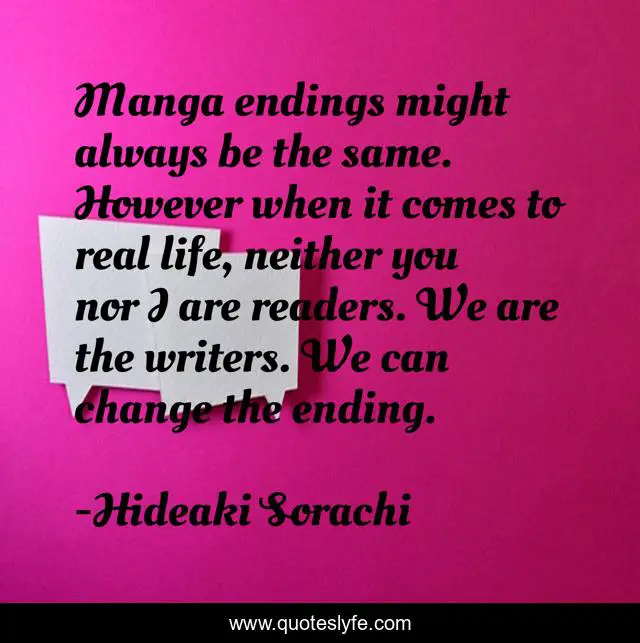This page presents the quote "Manga endings might always be the same. However when it comes to real life, neither you nor I are readers. We are the writers. We can change the ending.". Author of this quote is Hideaki Sorachi. This quote is about changing-your-perception, life, changing-your-mindset, gintama,.