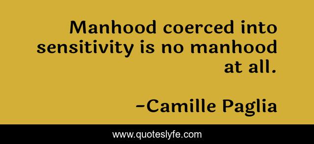 This page presents the quote "Manhood coerced into sensitivity is no manhood at all.". Author of this quote is Camille Paglia. This quote is about manhood, sensitivity,.