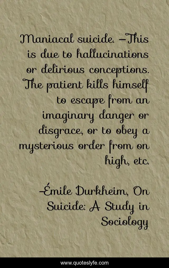 This page presents the quote "Maniacal suicide. —This is due to hallucinations or delirious conceptions. The patient kills himself to escape from an imaginary danger or disgrace, or to obey a mysterious order from on high, etc.". Author of this quote is Émile Durkheim, On Suicide: A Study in Sociology. This quote is about mania, suicide, 1897, psychology,.