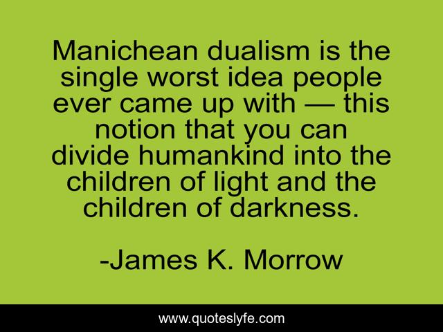 This page presents the quote "Manichean dualism is the single worst idea people ever came up with — this notion that you can divide humankind into the children of light and the children of darkness.". Author of this quote is James K. Morrow. This quote is about dualism, light, darkness, manichean,.