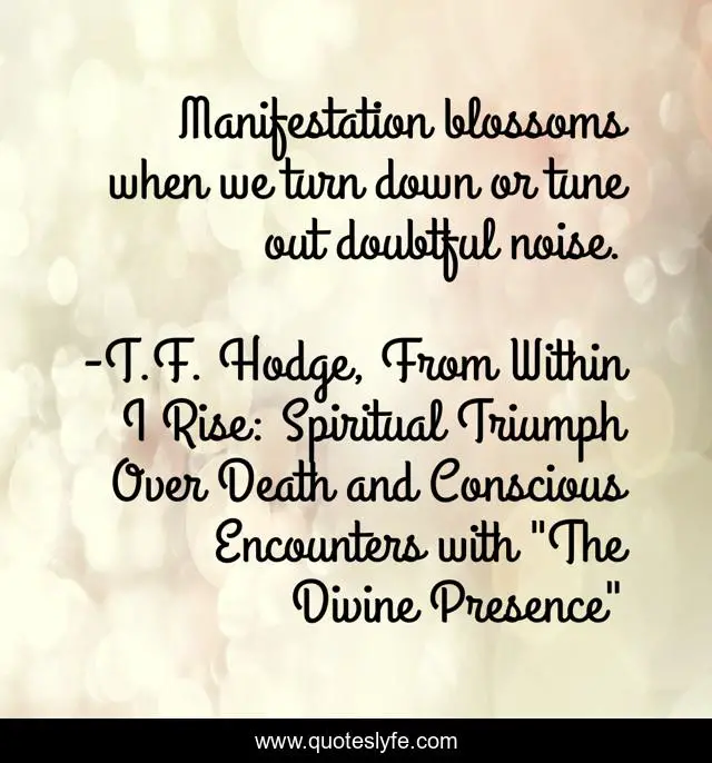 This page presents the quote "Manifestation blossoms when we turn down or tune out doubtful noise.". Author of this quote is T.F. Hodge, From Within I Rise: Spiritual Triumph Over Death and Conscious Encounters with "The Divine Presence". This quote is about blossom, distractions, self-doubt, noise, manifestation,.