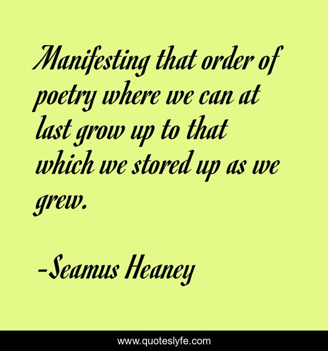 This page presents the quote "Manifesting that order of poetry where we can at last grow up to that which we stored up as we grew.". Author of this quote is Seamus Heaney. This quote is about grow up, grow,.