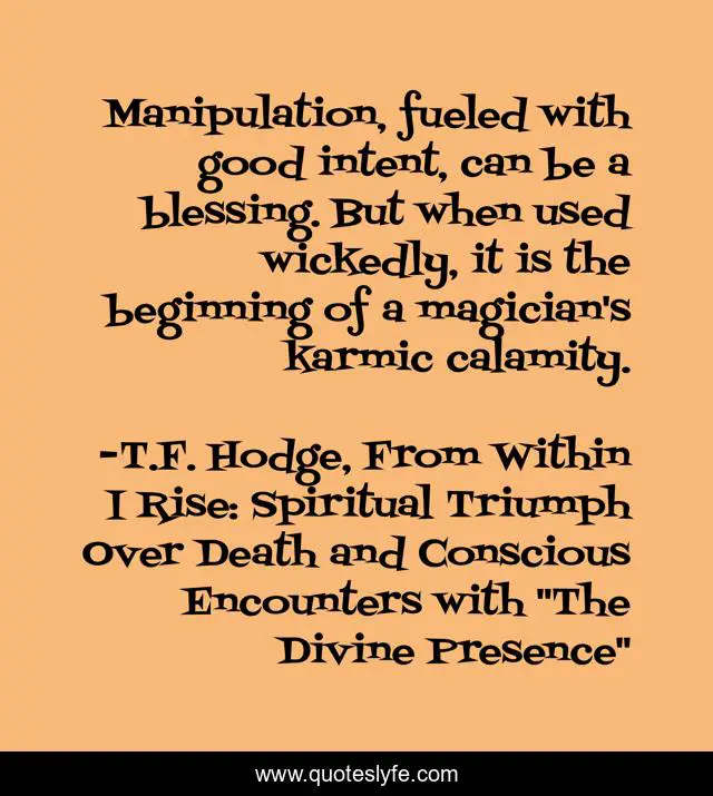 This page presents the quote "Manipulation, fueled with good intent, can be a blessing. But when used wickedly, it is the beginning of a magician's karmic calamity.". Author of this quote is T.F. Hodge, From Within I Rise: Spiritual Triumph Over Death and Conscious Encounters with "The Divine Presence". This quote is about control, confusion, sorcery, chaos, wizardry, quotes, calamity, blessings, karma,.