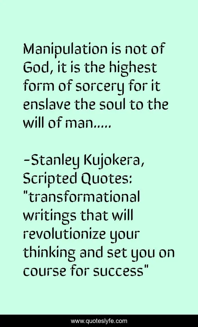 This page presents the quote "Manipulation is not of God, it is the highest form of sorcery for it enslave the soul to the will of man.....". Author of this quote is Stanley Kujokera, Scripted Quotes: "transformational writings that will revolutionize your thinking and set you on course for success". This quote is about confidence, success-self-improvement, leadership-development, positive, motivational, leadership, optimistic, inspirational, enthusiasm,.