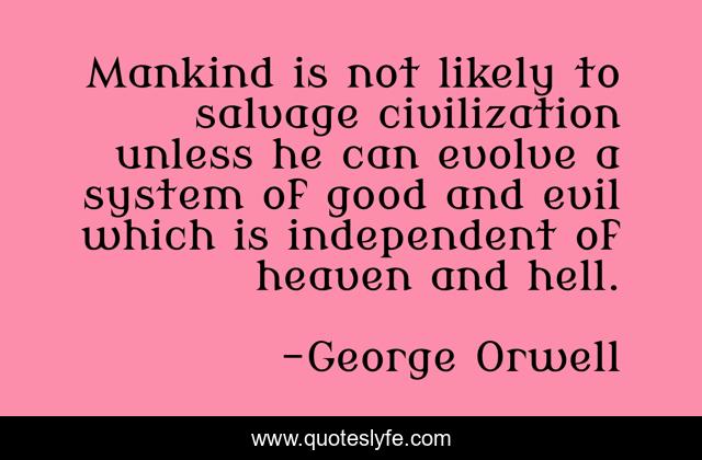 This page presents the quote "Mankind is not likely to salvage civilization unless he can evolve a system of good and evil which is independent of heaven and hell.". Author of this quote is George Orwell. This quote is about hell, evil, good and evil,.