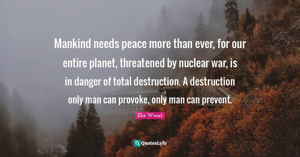 This page presents the quote "Mankind needs peace more than ever, for our entire planet, threatened by nuclear war, is in danger of total destruction. A destruction only man can provoke, only man can prevent.". Author of this quote is Elie Wiesel. This quote is about peace, mankind, men, nuclear war, danger, destruction, threatened, needs, war,.