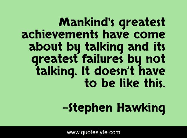 This page presents the quote "Mankind's greatest achievements have come about by talking and its greatest failures by not talking. It doesn’t have to be like this.". Author of this quote is Stephen Hawking. This quote is about communication, diplomacy, inspirational, enthusiasm,.
