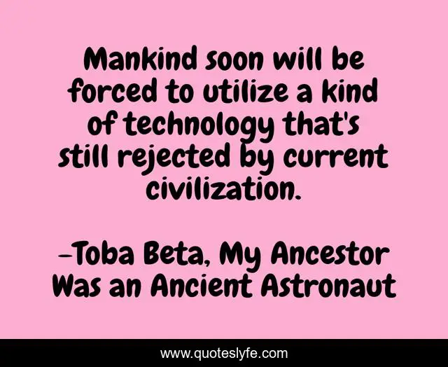This page presents the quote "Mankind soon will be forced to utilize a kind of technology that's still rejected by current civilization.". Author of this quote is Toba Beta, My Ancestor Was an Ancient Astronaut. This quote is about revolution, technology,.