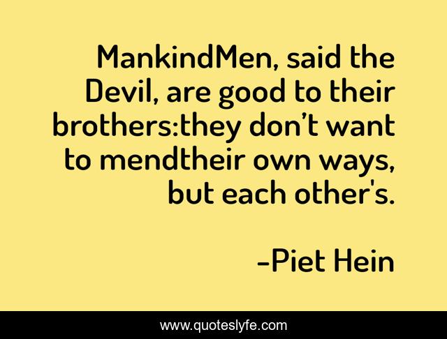 This page presents the quote "MankindMen, said the Devil, are good to their brothers:they don’t want to mendtheir own ways, but each other's.". Author of this quote is Piet Hein. This quote is about devil, mankind,.