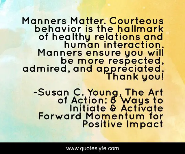 "Susan C. Young, The Art of Action: 8 Ways to Initiate & Activate Forward Momentum for Positive Impact Quotes." Quoteslyfe.com, 2025. Sun. 07 Dec. 2025. <https://www.quoteslyfe.com/quote/Manners-Matter-Courteous-behavior-is-the-hallmark-233459>.