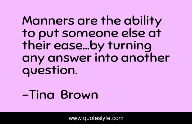 This page presents the quote "Manners are the ability to put someone else at their ease...by turning any answer into another question.". Author of this quote is Tina Brown. This quote is about conversation, manners, etiquette,.