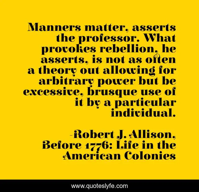 This page presents the quote "Manners matter, asserts the professor. What provokes rebellion, he asserts, is not as often a theory out allowing for arbitrary power but be excessive, brusque use of it by a particular individual.". Author of this quote is Robert J. Allison, Before 1776: Life in the American Colonies. This quote is about graciousness, habits, influence, personality,.