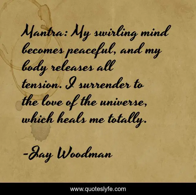 This page presents the quote "Mantra: My swirling mind becomes peaceful, and my body releases all tension. I surrender to the love of the universe, which heals me totally.". Author of this quote is Jay Woodman. This quote is about healthy-habits, love, tension-relief, universe, peace, mind, wellbeing, peace-of-mind, relaxation,.