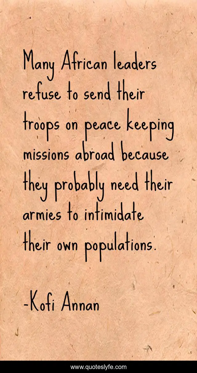 This page presents the quote "Many African leaders refuse to send their troops on peace keeping missions abroad because they probably need their armies to intimidate their own populations.". Author of this quote is Kofi Annan. This quote is about need, leaders, abroad,.