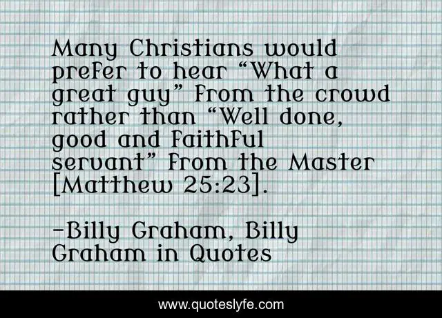 This page presents the quote "Many Christians would prefer to hear “What a great guy” from the crowd rather than “Well done, good and faithful servant” from the Master [Matthew 25:23].". Author of this quote is Billy Graham, Billy Graham in Quotes. This quote is about service, billy-graham,.
