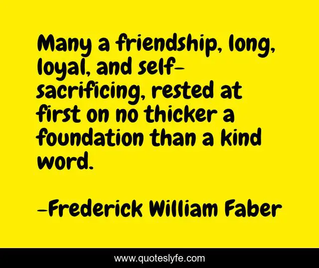 This page presents the quote "Many a friendship, long, loyal, and self-sacrificing, rested at first on no thicker a foundation than a kind word.". Author of this quote is Frederick William Faber. This quote is about foundation, kind, long,.