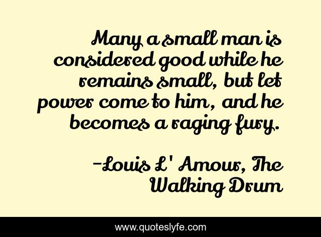 This page presents the quote "Many a small man is considered good while he remains small, but let power come to him, and he becomes a raging fury.". Author of this quote is Louis L'Amour, The Walking Drum. .