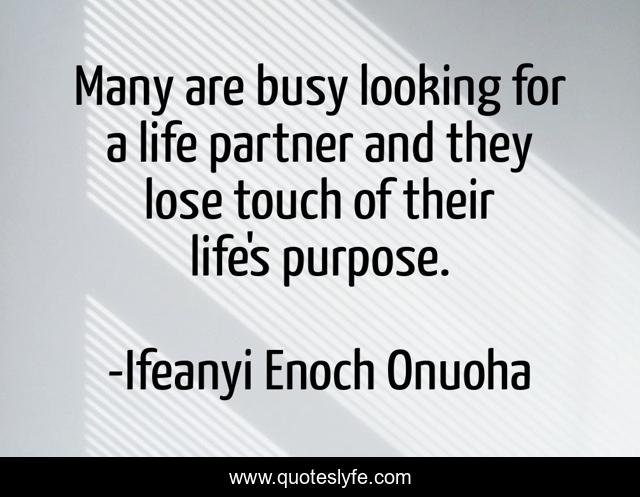 This page presents the quote "Many are busy looking for a life partner and they lose touch of their life's purpose.". Author of this quote is Ifeanyi Enoch Onuoha. This quote is about life, hinovelty, quote, singlehood, ifeanyi-enoch-onuoha, marriage, purpose, vision,.
