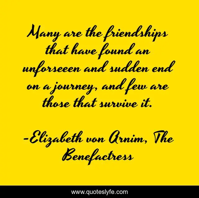 This page presents the quote "Many are the friendships that have found an unforseeen and sudden end on a journey, and few are those that survive it.". Author of this quote is Elizabeth von Arnim, The Benefactress. This quote is about travel, friendship,.