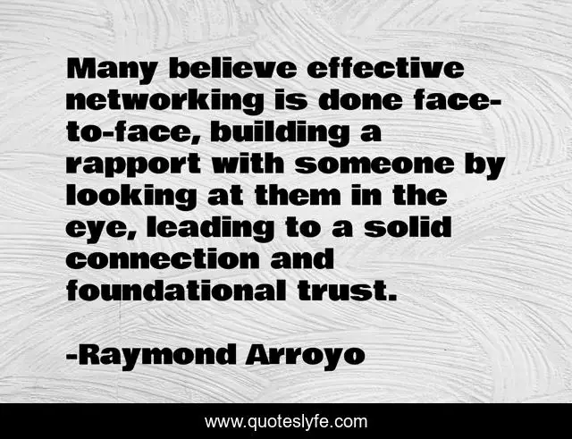 This page presents the quote "Many believe effective networking is done face-to-face, building a rapport with someone by looking at them in the eye, leading to a solid connection and foundational trust.". Author of this quote is Raymond Arroyo. This quote is about eye, believe, networking,.