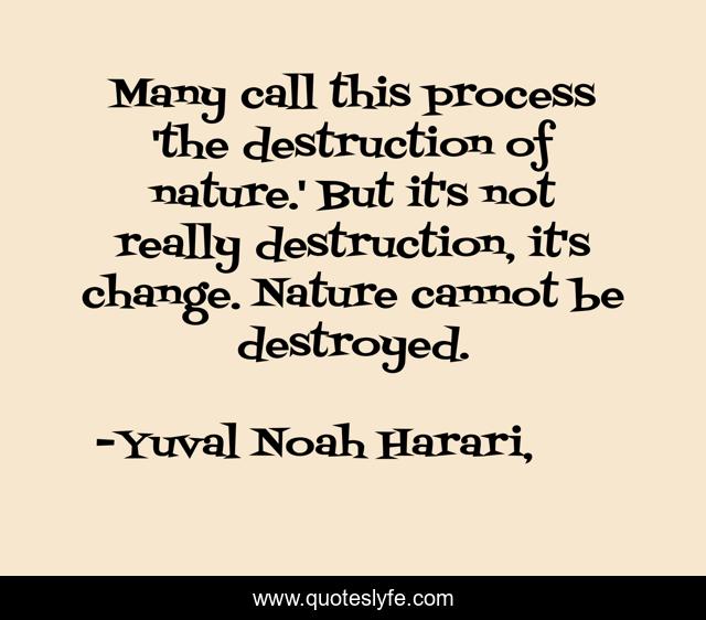 This page presents the quote "Many call this process 'the destruction of nature.' But it's not really destruction, it's change. Nature cannot be destroyed.". Author of this quote is Yuval Noah Harari, קיצור תולדות האנושות. This quote is about evolution, destruction-of-nature, change-management, nature,.