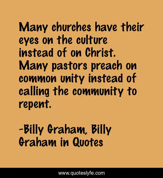 This page presents the quote "Many churches have their eyes on the culture instead of on Christ. Many pastors preach on common unity instead of calling the community to repent.". Author of this quote is Billy Graham, Billy Graham in Quotes. This quote is about preaching, billy-graham,.