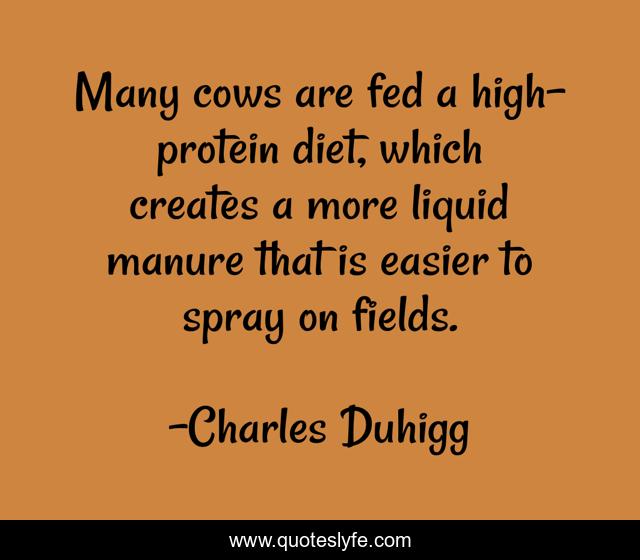 This page presents the quote "Many cows are fed a high-protein diet, which creates a more liquid manure that is easier to spray on fields.". Author of this quote is Charles Duhigg. This quote is about cows, fields, easier,.