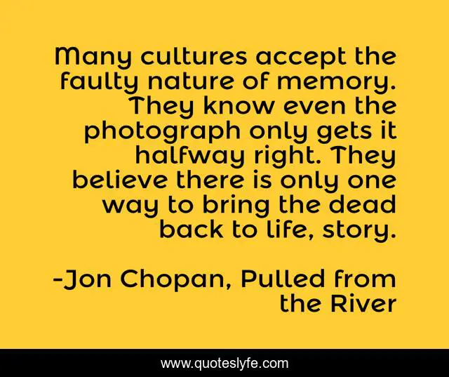 This page presents the quote "Many cultures accept the faulty nature of memory. They know even the photograph only gets it halfway right. They believe there is only one way to bring the dead back to life, story.". Author of this quote is Jon Chopan, Pulled from the River. This quote is about photographs, storytelling,.