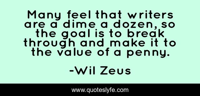 This page presents the quote "Many feel that writers are a dime a dozen, so the goal is to break through and make it to the value of a penny.". Author of this quote is Wil Zeus. This quote is about life, philosophical, thought-provoking-humourous,.