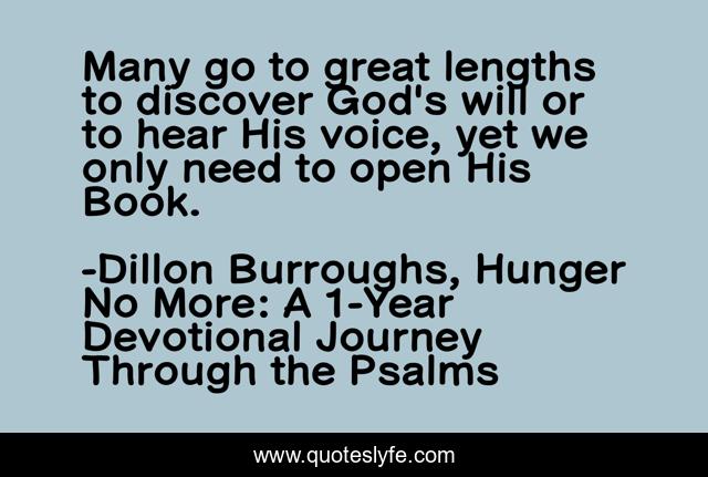This page presents the quote "Many go to great lengths to discover God's will or to hear His voice, yet we only need to open His Book.". Author of this quote is Dillon Burroughs, Hunger No More: A 1-Year Devotional Journey Through the Psalms. This quote is about god-s-will, bible, god-s-word,.