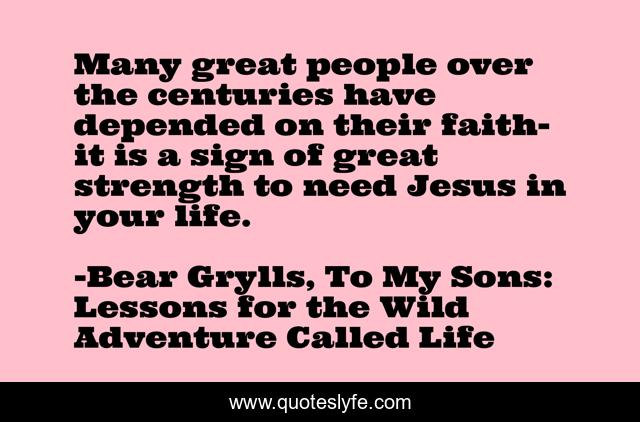 This page presents the quote "Many great people over the centuries have depended on their faith- it is a sign of great strength to need Jesus in your life.". Author of this quote is Bear Grylls, To My Sons: Lessons for the Wild Adventure Called Life. This quote is about greatness, faith, strength, jesus,.