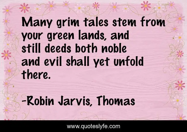 This page presents the quote "Many grim tales stem from your green lands, and still deeds both noble and evil shall yet unfold there.". Author of this quote is Robin Jarvis, Thomas. This quote is about noble, tales, deeds, grim, evil,.