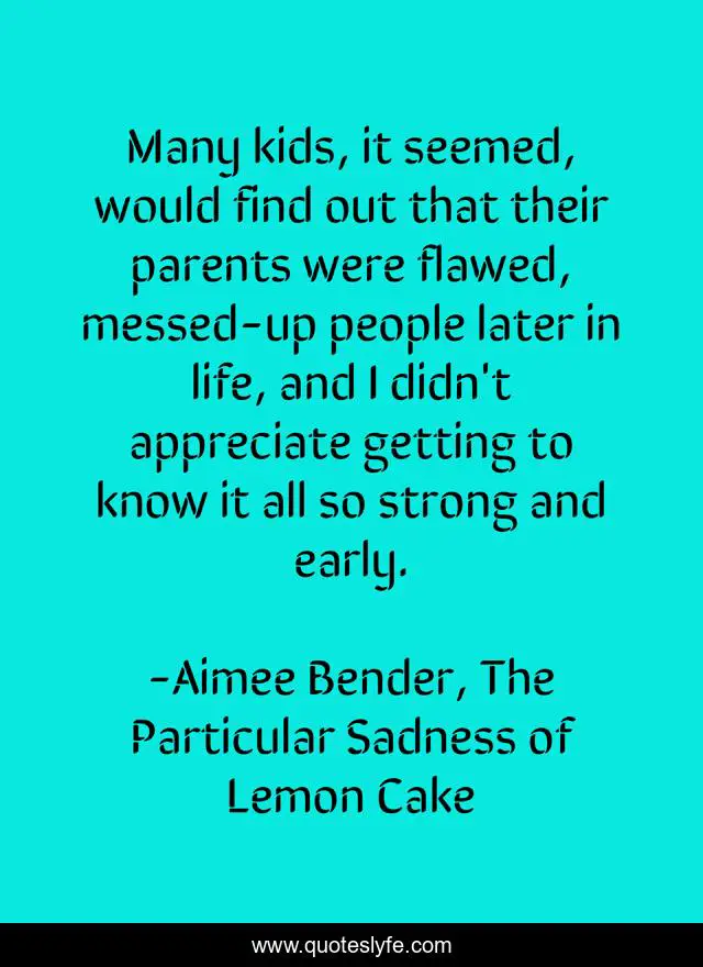 This page presents the quote "Many kids, it seemed, would find out that their parents were flawed, messed-up people later in life, and I didn't appreciate getting to know it all so strong and early.". Author of this quote is Aimee Bender, The Particular Sadness of Lemon Cake. .