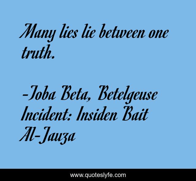 This page presents the quote "Many lies lie between one truth.". Author of this quote is Toba Beta, Betelgeuse Incident: Insiden Bait Al-Jauza. This quote is about lie, life, truth,.