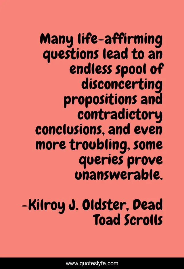 This page presents the quote "Many life-affirming questions lead to an endless spool of disconcerting propositions and contradictory conclusions, and even more troubling, some queries prove unanswerable.". Author of this quote is Kilroy J. Oldster, Dead Toad Scrolls. This quote is about doubting-mind, distress, confusion, doubt, self-questioning, questions-about-life, questions-in-life,.