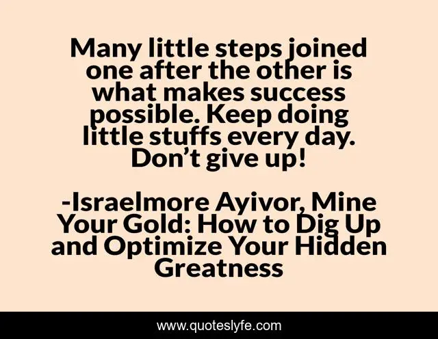 This page presents the quote "Many little steps joined one after the other is what makes success possible. Keep doing little stuffs every day. Don’t give up!". Author of this quote is Israelmore Ayivor, Mine Your Gold: How to Dig Up and Optimize Your Hidden Greatness. This quote is about huge, food-for-thought, little-things, bit-by-bit, success, successful, big, little, tiny,.