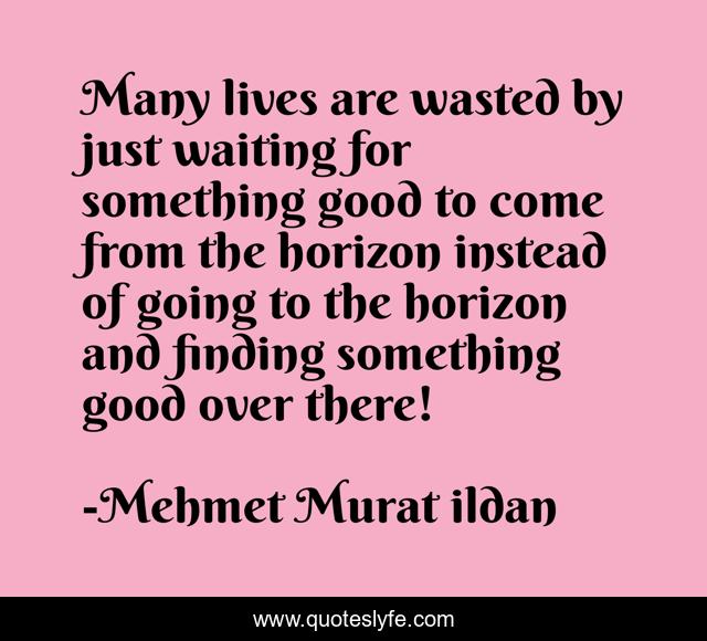 This page presents the quote "Many lives are wasted by just waiting for something good to come from the horizon instead of going to the horizon and finding something good over there!". Author of this quote is Mehmet Murat ildan. This quote is about something-good, turkish-aphorisms, mehmet-murat-ildan, ildan-wise-sayings, turkish, horizons, turkish-sayings, wasted-time, turkish-playwrights,.