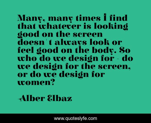 This page presents the quote "Many, many times I find that whatever is looking good on the screen doesn't always look or feel good on the body. So who do we design for - do we design for the screen, or do we design for women?". Author of this quote is Alber Elbaz. This quote is about feel good, good, women,.