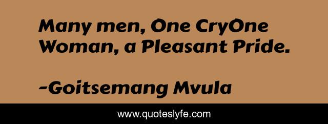 This page presents the quote "Many men, One CryOne Woman, a Pleasant Pride.". Author of this quote is Goitsemang Mvula. This quote is about pride, cry, men, women,.