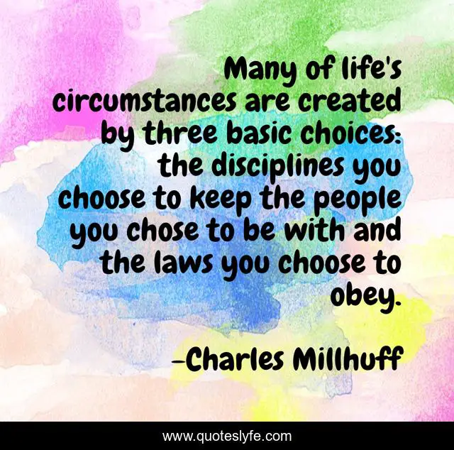 This page presents the quote "Many of life's circumstances are created by three basic choices: the disciplines you choose to keep the people you chose to be with and the laws you choose to obey.". Author of this quote is Charles Millhuff. .