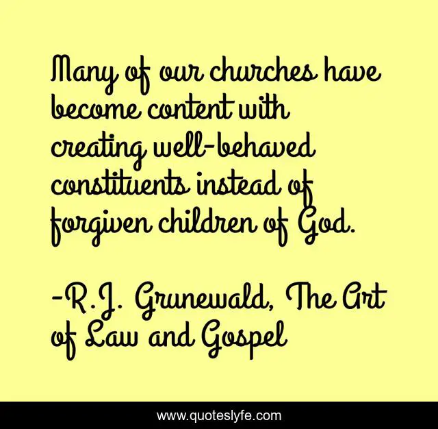 This page presents the quote "Many of our churches have become content with creating well-behaved constituents instead of forgiven children of God.". Author of this quote is R.J. Grunewald, The Art of Law and Gospel. This quote is about churches, forgiveness,.