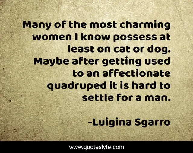 This page presents the quote "Many of the most charming women I know possess at least on cat or dog. Maybe after getting used to an affectionate quadruped it is hard to settle for a man.". Author of this quote is Luigina Sgarro. This quote is about single, cat, dog, women,.