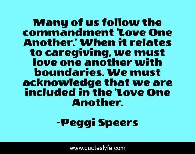 This page presents the quote "Many of us follow the commandment 'Love One Another.' When it relates to caregiving, we must love one another with boundaries. We must acknowledge that we are included in the 'Love One Another.". Author of this quote is Peggi Speers. This quote is about caring, caregiver, love, quotes-for-caregivers, alzheimers, quotes-on-love, caregiving, alzheimer-s, caring-for-others,.